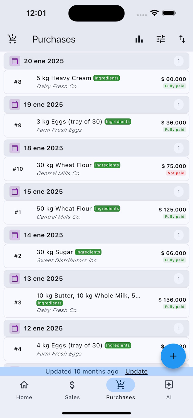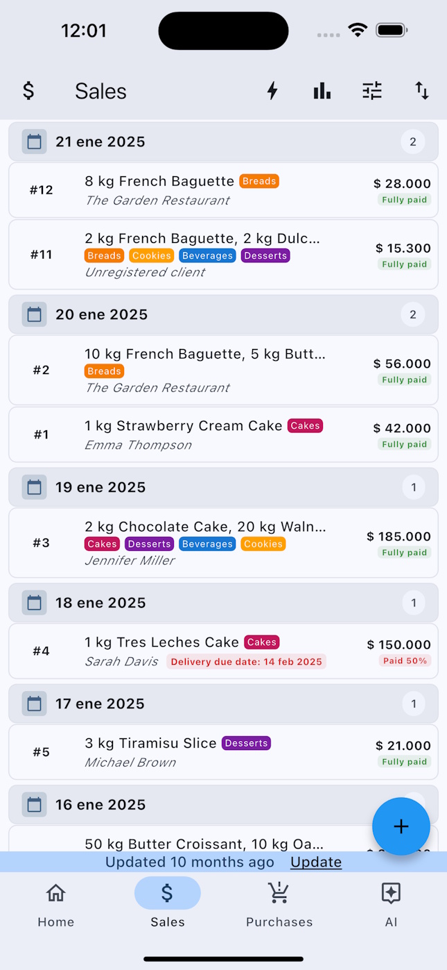 - Sales and Purchases Management: Record sold or purchased products, prices, payment methods, and delivery dates.